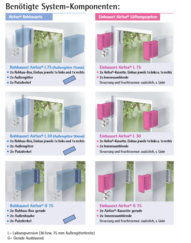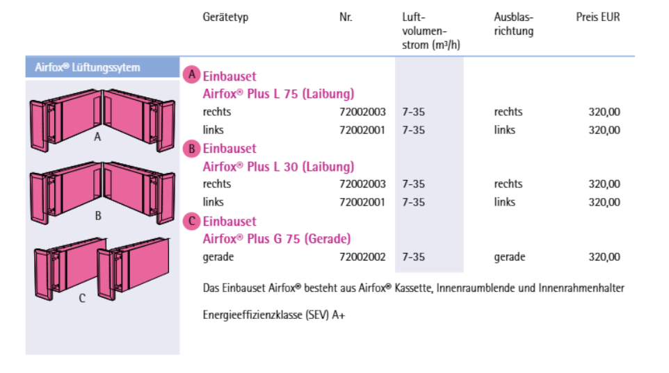 AIRFOX PLUS® – Effiziente Lüftung mit Wärmerückgewinnung für frische LuftErleben Sie überragenden Wohnkomfort mit dem AIRFOX PLUS® – für gesunde, frische Luft und maximale Energieeffizienz.Das AIRFOX PLUS® ist ein hocheffizientes dezentrales Einzelraum-Lüftungsgerät, das diskret in die Laibung integriert wird. Es arbeitet nach dem Prinzip des reversierenden Luftstroms und bietet fortschrittliche Wärmerückgewinnung. Die intelligente Wechsellüftung sorgt für eine kontinuierliche Zufuhr von gefilterter, gereinigter Luft, während verbrauchte Luft abgeführt wird. Dies verhindert effektiv Schimmelbildung und sorgt für ein stets angenehmes und gesundes Raumklima, frei von Pollen und Schadstoffen.Ihre Vorteile im Überblick:Fast unsichtbar: Das Lüftungsgitter ist unauffällig in die Laibung integriert und fügt sich harmonisch in jede Architektur ein.Keine Schimmelbildung: Schimmelbildung durch Lüftungsdefizite wird zuverlässig verhindert, was zu einem gesünderen Wohnklima beiträgt.Energieeffizient: Dank integrierter Wärmerückgewinnung werden Wärmeverluste minimiert, die bei herkömmlicher Fensterlüftung entstehen würden, was Ihre Heizkosten senkt.Einfacher Filterwechsel: Der Filter ist günstig und kann nach einfachem Entfernen der Innenblende schnell und unkompliziert gewechselt werden.Sehr wartungsarm: Die Anlagenmechanik ist leicht zugänglich und ermöglicht eine einfache, schnelle Wartung, wodurch Zeit und Kosten gespart werden.Extrem leise: Das System arbeitet flüsterleise und bietet zusätzlich eine hervorragende Schalldämmung nach außen, für ungestörte Ruhe.Kein Umschaltgeräusch wie am Markt üblich: Eine spezielle Technologie und der Einsatz von zwei Ventilatoren verhindern die am Markt üblichen Umschaltgeräusche für maximalen Komfort.Dezentrale WärmerückgewinnungDas AIRFOX PLUS® nutzt das Prinzip des reversierenden Luftstroms, um mit einer Wärmerückgewinnungsrate von über 90 % Wärmeverluste zu minimieren. Dies gewährleistet eine effiziente Temperierung Ihrer Räume, während kontinuierlich frische Luft zugeführt wird.Profitieren Sie von erheblichen Energieeinsparungen, da die Wärmeenergie der Abluft zurückgewonnen und auf die Zuluft übertragen wird. So bleibt Ihr Raum warm und gut belüftet, ohne teure Energie zu verschwenden.Flexible BetriebsmodiDas Lüftungsgerät bietet die Möglichkeit, einen reinen Sommerluftmodus oder einen Abluftmodus ohne Wärmerückgewinnung nach Bedarf zu betreiben. Diese Anpassungsfähigkeit macht das AIRFOX PLUS® zu einer ganzjährigen Lösung.Ob frische Luft im Sommer ohne Wärmetausch oder gezielte Abluft – Sie haben stets die Kontrolle über Ihr Raumklima und können flexibel auf Wetterbedingungen und individuelle Präferenzen reagieren.Kontinuierlicher Luftaustausch & FilterungDie intelligente Wechsellüftung des AIRFOX PLUS® tauscht verbrauchte Raumluft kontinuierlich gegen frische, gefilterte Außenluft aus. Standardmäßig mit G3-Filtern ausgestattet und optional mit F7-Filtern erweiterbar, bietet es effektiven Schutz.Dies befreit Ihre Innenräume zuverlässig von Pollen, Allergenen und anderen Schadstoffen, wodurch ein anhaltend angenehmes, sauberes und gesundes Wohn- oder Arbeitsklima gefördert wird.Technische SpezifikationenParameterWertBesonderheitVolumenstrom Leistung10 / 25 / 35 / 47 m³/hVier wählbare StufenEigengeräusch Stufe 1< 12,7 dB(A)Extrem leiser BetriebEigengeräusch Stufe 2< 23 dB(A)Eigengeräusch Stufe 3< 29,5 dB(A)Eigengeräusch Stufe 4< 38 dB(A)Stoßlüften 15 minLuftleistung Stufe 110 m³/hLuftleistung Stufe 225 m³/hLuftleistung Stufe 335 m³/hLuftleistung Stufe 447 m³/hFür schnelles StoßlüftenLeistungsaufnahme Stufe 1weniger als 3,8 WattSehr geringer EnergieverbrauchLeistungsaufnahme Stufe 2weniger als 3,7 WattLeistungsaufnahme Stufe 3< 5,7 WattLeistungsaufnahme Stufe 4weniger als 8,2 WattWärmebereitstellungsgradbis über 90 %Hohe EnergieeffizienzNormalschallpegeldifferenzbis zu 51 dBHervorragende SchalldämmungFilterklasseG3 / F7 optionalFür saubere LuftEnergieeffizienzklasse (SEV)A+Bei Verwendung des optionalen LuftfeuchtesensorsEnergieeffizienzklasse (SEV)AOhne Verwendung des optionalen LuftfeuchtesensorsAbmessungMaßHinweisMinimale Wandstärke32 cmInklusive PutzInnenblende (BxH)11,5 cm x 26 cmKompaktes und diskretes DesignAußengitter (BxH)7,5 cm x 24,8 cmUnauffällige IntegrationEinsatzbereiche & AnwendungsszenarienDas AIRFOX PLUS® ist die ideale Lösung für alle, die Wert auf ein gesundes und energieeffizientes Raumklima legen. Es eignet sich hervorragend für Wohnräume, Schlafzimmer, Kinderzimmer und Büros, wo eine kontinuierliche Frischluftzufuhr ohne Wärmeverluste und Zugerscheinungen gewünscht ist. Besonders in sanierten oder energieeffizienten Gebäuden hilft es, Feuchtigkeitsprobleme und Schimmelbildung effektiv vorzubeugen und Allergiker durch die Filterung von Pollen und Feinstaub zu entlasten.Hersteller & QualitätDer AIRFOX PLUS® steht für höchste Qualität, innovative Technologie und herausragendes Design, bestätigt durch renommierte Auszeichnungen. Dazu gehören der German Design Award 2024 in der Kategorie Excellent Product Design - Energy, der BAKA Award für Produktinnovation des Bundesverbandes für Altbauerneuerung und der ARCHITECTS‘ DARLING. Diese Anerkennungen unterstreichen die führende Rolle und die Zuverlässigkeit des Systems.Investieren Sie in Ihre Gesundheit und Ihr Wohlbefinden. Das AIRFOX PLUS® sorgt dauerhaft für ein optimales Raumklima, schützt Ihre Bausubstanz und senkt Ihre Energiekosten.Erleben Sie den Unterschied eines wirklich intelligenten Lüftungssystems. Kontaktieren Sie uns für eine individuelle Beratung, um die perfekte Lüftungslösung für Ihr Zuhause zu finden und von den Vorteilen des AIRFOX PLUS® zu profitieren.