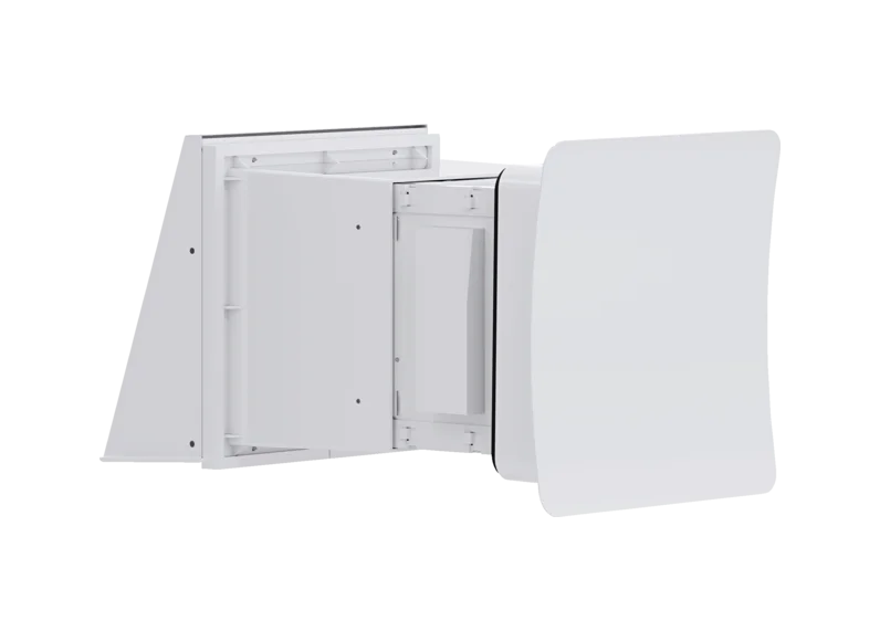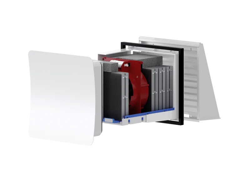 Ausgestattet mit einem gegendruckstabilen Axiallüfter und einer schlagregendichten Außenblende aus pulverbeschichtetem Edelstahl ist das Lüftungsgerät auch für windexponierte Lagen geeignet und garantiert langlebigen, zuverlässigen Betrieb.