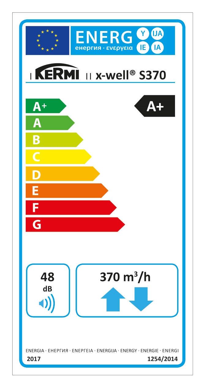 | x-well Wohnraumlüftungsgerät S370 / S370 E | bis ca. 240 m2 | 92,5 % / 82,7 % | 46 dB(A) | A+ / A |