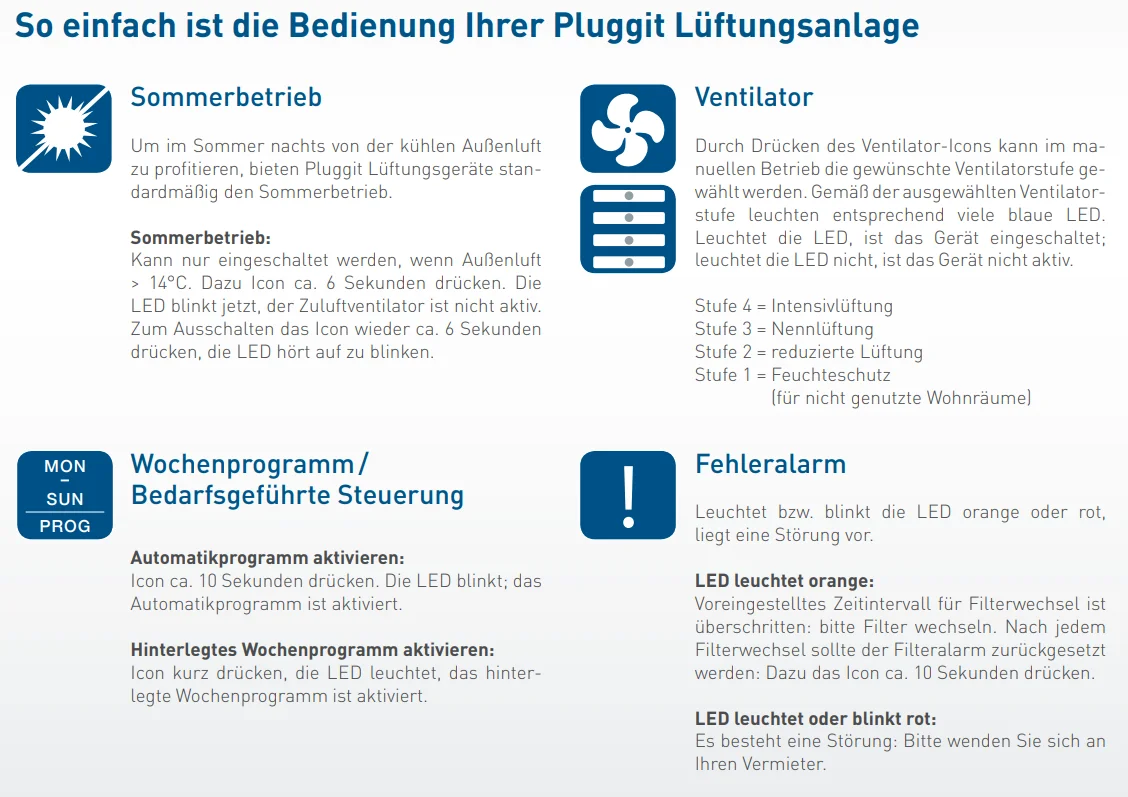 - PLUGGIT Lüftungsgeräte zeichnen sich durch eine hohe Energieeffizienz und Wirkeffizienz aus, da sie eine hohe Wärmerückgewinnung und hocheffiziente Gleichstrom-Ventilatoren nutzen.