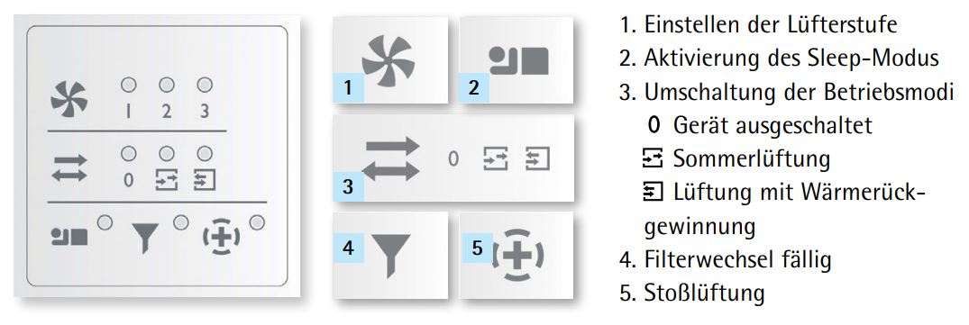 Während der Lüfter in Betrieb ist, findet gleichzeitig der Abtransport der Abluft sowie die Zuführung von Zuluft statt. Dabei passiert die ausgehende Luft einen Abluftfilter der Filterklasse G3 sowie die integrierte Wärmetauschereinheit. Letztere entzieht der Abluft die Wärmeenergie und speichert sie zwischen. Parallel dazu strömt frische Luft von außen ein, wird mit der zwischengespeicherten Wärmeenergie erwärmt und ebenfalls durch G3 Staubfilter geleitet. Allergiker können optional an dieser Stelle einen Pollenfilter einsetzen.